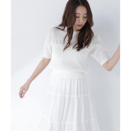 複数の編地切り替えが立体感とアクセントを生むニット。シンプルなボトムスと合わせるだけで華やかなコーディネートが完成します。コンパクトなシルエットでボトムスにインしやすく、スカートやパンツともバランスよく着ていただけます。<素材>ハリ感のあるドライタッチの糸を使用しています。<詳細>仕様・開閉なし裏地・なし透け感・あり / 光沢・なし / 伸縮性・あり生地の厚さ・普通※モデルの着用画像の場合、光の当たり具合により、実際の色味と異なって見えることがございます。色味は、商品単体の画像をご参照ください。