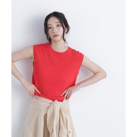 一枚着にもレイヤードにも活躍するニットトップス。抜け感のあるノースリーブデザインと程よいゆとりのあるリラクシーなシルエットで、柔らかな編地が軽やかな着心地です。肩まわりをすっきり見せるバランスで、様々なスタイリングに合わせやすい一枚です。<素材>細いテープヤーンの天竺編みニットです。<詳細>仕様・開閉なし裏地・なし透け感・なし / 光沢・なし / 伸縮性・あり生地の厚さ・普通※モデルの着用画像の場合、光の当たり具合により、実際の色味と異なって見えることがございます。色味は、商品単体の画像をご参照ください。