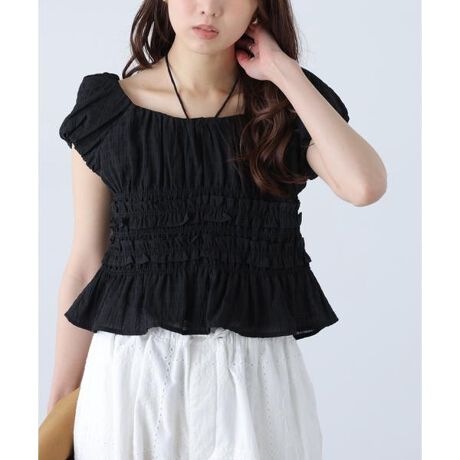 シボ感のある素材にギャザーのふんわりとした柔らかい印象で、旬なスタイリングが作れるブラウス。すっきりと開けたネックラインが、デコルテ周りをキレイに見せてくれます。フリルとシャーリングを施したウエストラインでメリハリを作り、バランスの取りやすいシルエットに。シャーリングによる伸縮性もあり着用しやすいのも嬉しいポイント。ホルターリボンは取り外し可能で、オフショルダー風に着るときにも安定感があります。ワイドデニムパンツ・スラックスなどのボトムス合わせがおすすめです。※モデルの着用画像の場合、光の当たり具合により、実際の色味と異なって見えることがございます。色味は、商品単体の画像をご参照ください。