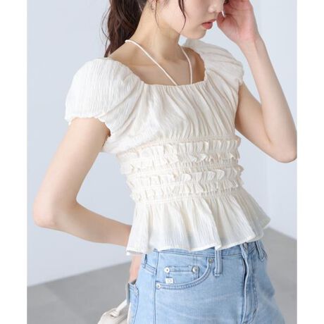 シボ感のある素材にギャザーのふんわりとした柔らかい印象で、旬なスタイリングが作れるブラウス。すっきりと開けたネックラインが、デコルテ周りをキレイに見せてくれます。フリルとシャーリングを施したウエストラインでメリハリを作り、バランスの取りやすいシルエットに。シャーリングによる伸縮性もあり着用しやすいのも嬉しいポイント。ホルターリボンは取り外し可能で、オフショルダー風に着るときにも安定感があります。ワイドデニムパンツ・スラックスなどのボトムス合わせがおすすめです。※モデルの着用画像の場合、光の当たり具合により、実際の色味と異なって見えることがございます。色味は、商品単体の画像をご参照ください。