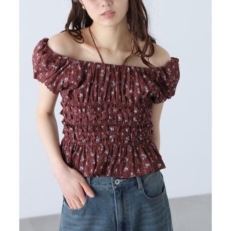 シボ感のある素材にギャザーのふんわりとした柔らかい印象で、旬なスタイリングが作れるブラウス。すっきりと開けたネックラインが、デコルテ周りをキレイに見せてくれます。フリルとシャーリングを施したウエストラインでメリハリを作り、バランスの取りやすいシルエットに。シャーリングによる伸縮性もあり着用しやすいのも嬉しいポイント。ホルターリボンは取り外し可能で、オフショルダー風に着るときにも安定感があります。ワイドデニムパンツ・スラックスなどのボトムス合わせがおすすめです。※モデルの着用画像の場合、光の当たり具合により、実際の色味と異なって見えることがございます。色味は、商品単体の画像をご参照ください。