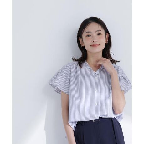 爽やかなストライプ柄が目を引くブラウス。Vネックで顔まわりをすっきりと見せ、立体感のあるフリルネックが華やかなアクセントになっています。動きのあるフレアスリーブで軽やかさを出し、一枚でフェミニンな印象に見せてくれます。<素材>ストライプのシャツ素材を使用しています。<詳細>仕様・前ボタン裏地・なし透け感・なし / 光沢・なし / 伸縮性・なし生地の厚さ・普通※モデルの着用画像の場合、光の当たり具合により、実際の色味と異なって見えることがございます。色味は、商品単体の画像をご参照ください。