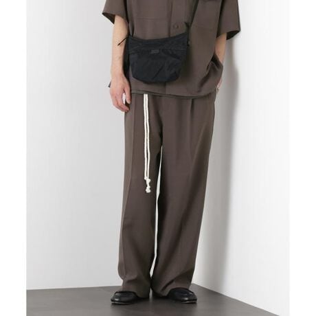 タックの入った仕様が立体感を作りきれいな落ち感を演出するワイドスラックス。キレイめに見える一方でメランジドライの素材感が着用時のリラックスさを作る一本。