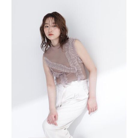 一枚で華やかに着映えるチュールフリルドッキングニット。すっきりとしたモックネックにノースリーブデザインで、軽やかな印象です。身頃にはギャザーを寄せたチュールフリルをランダムにあしらい、華やかでフェミニンな印象に。マーメイドスカートやナロースカートでキレイめに、デニムでカジュアルダウンも楽しめます。<素材>ドライタッチでキレイな目面の糸をリブ編みで編み立て、柔らかいチュール素材をドッキングしています。<詳細>仕様・開閉なし裏地・なし透け感・なし / 光沢・なし / 伸縮性・あり生地の厚さ・普通※モデルの着用画像の場合、光の当たり具合により、実際の色味と異なって見えることがございます。色味は、商品単体の画像をご参照ください。