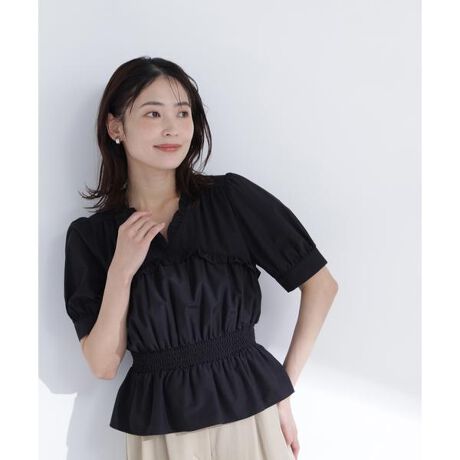 フリルディテールがポイントの着映えブラウス。身頃の切り替え部分にギャザーとフリルをあしらい、一枚で華やかな印象に見せてくれます。程よいハリ感のあるブロード素材で、フェミニンなデザインでも甘くなりすぎず上品に着ていただけます。袖はギャザーをいれたパフスリーブデザイン、ウエストはゴムシャーリング仕様のペプラムシルエット。ナロースカートやストレートパンツ、デニムとのカジュアルダウンもおすすめです。<素材>程よくハリ感のあるブロード素材を使用しています。<詳細>仕様・開閉なし裏地・なし透け感・なし / 光沢・なし / 伸縮性・なし生地の厚さ・普通※モデルの着用画像の場合、光の当たり具合により、実際の色味と異なって見えることがございます。色味は、商品単体の画像をご参照ください。
