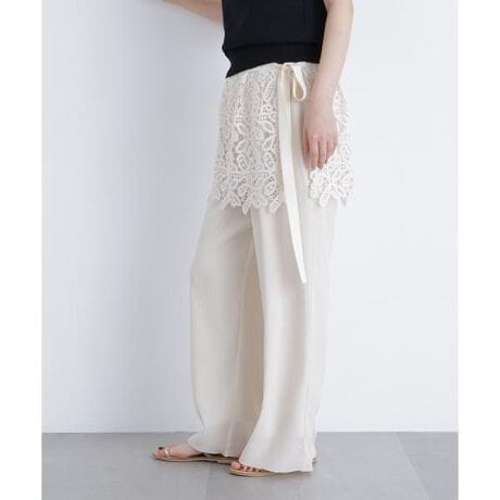 楊柳パンツと立体感のあるレースエプロンのレイヤードセット。レースエプロンはサイドリボンで着脱できます。パンツはウエストぐるりゴム仕様で快適なはき心地。表情ゆたかな楊柳素材にレースエプロンを重ねることで、軽やかで奥行きのあるスタイリングが楽しめます。<素材>エプロンはケミカルレース、パンツは楊柳素材を使用しています。<詳細>仕様・開閉なし裏地・あり透け感・なし / 光沢・なし / 伸縮性・ややあり生地の厚さ・普通※モデルの着用画像の場合、光の当たり具合により、実際の色味と異なって見えることがございます。色味は、商品単体の画像をご参照ください。