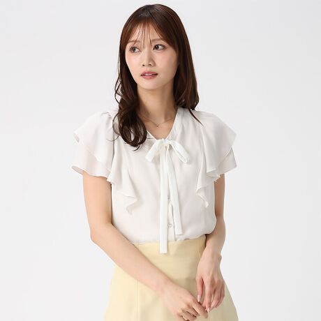 配色リボンとドット柄が目を引く、シフォンジョーゼット素材のブラウス。