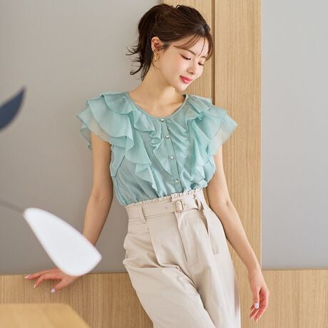 ラッフルフリルが顔まわりに華やかさをプラスし、一枚で着映えするデザインに仕上げています。