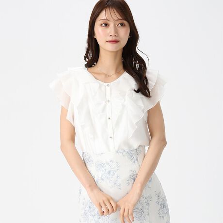 ラッフルフリルが顔まわりに華やかさをプラスし、一枚で着映えするデザインに仕上げています。