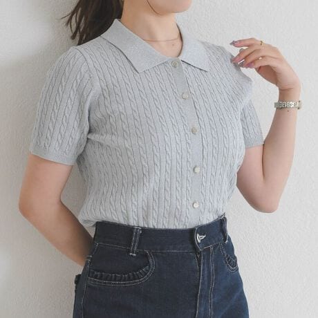 ケーブル編みがトレンド感を添える、ポロ衿デザインのニット。