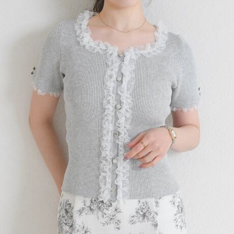 レースフリルトリミングが華やかな印象を与える半袖ニット。