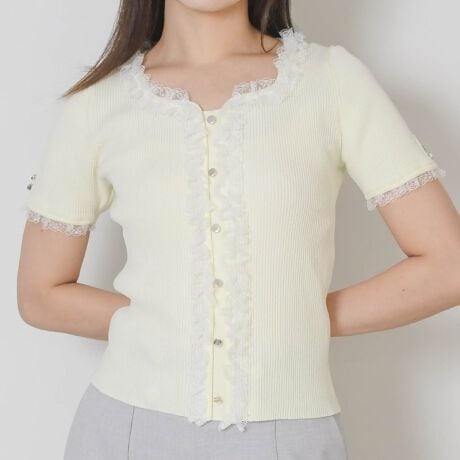 レースフリルトリミングが華やかな印象を与える半袖ニット。