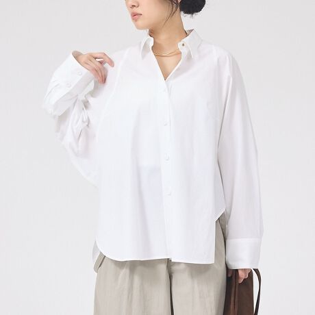 ラグランスリーブ風のゆったりとしたアームホールと、肩幅を狭めに設定した華奢見えするシルエットが特徴。バックには細いピンタックを配し、後ろ姿にもさりげないアクセントを添えています。前立て仕様で開閉しやすく、シャツとしての着用から織りのレイヤードまで幅広く対応します。