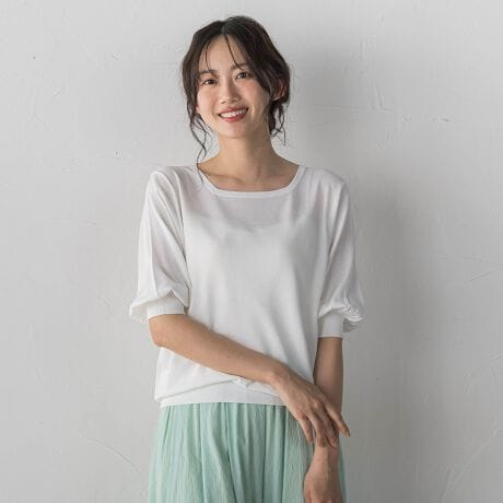 しなやかなレーヨンに程よいストレッチ性をプラスした、さらりとした清涼感のある肌触りが心地よいニット。