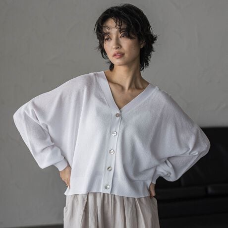 ドルマンスリーブのゆるやかなフォルムが、こなれた印象を演出するニットカーディガン。