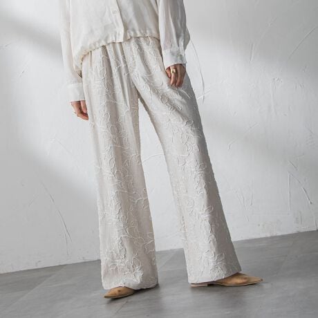 立体感のあるコード刺繍でボタニカルモチーフを描いた、存在感のあるイージーワイドパンツ。