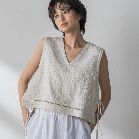 関連ワード:MAYSON GREY メイソングレイ レディース 新作 大人コーデ 大人カジュアル 2026春夏 2026SS 春夏 春物 春服 ベスト コットン ポリエステル レーヨン 麻・リネン レース Vネック 花・植物 刺繍 ノースリーブ