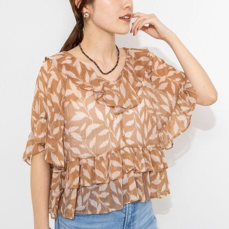 【Import Fabric】ウォッシャブル楊柳リーフ柄フリルブラウス
