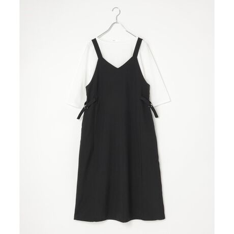 麻調でさらりとした手触りのワンピースと、天竺のTシャツの組み合わせ 。