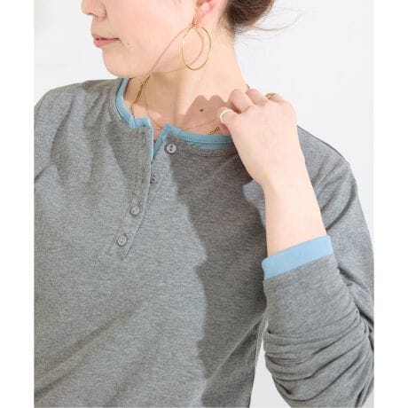 襟元の配色デザインがアクセントになったヘンリーネックトップス。