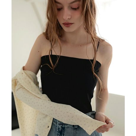 細めのゴムストラップがデコルテや肩周りを華奢に見せてくれるキャミソール。