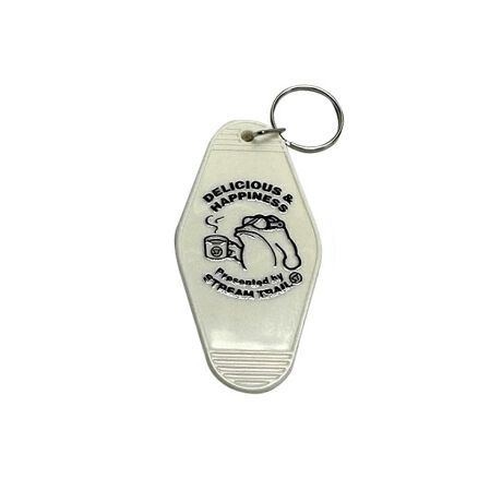 「Delicious&Happiness」コーヒーのオリジナルキーホルダー。懐かしいモーテルキーホルダーに、コーヒータイムのイラストをプリント。鍵やバッグに付けるだけで、さりげなく気分が上がる小物になります。