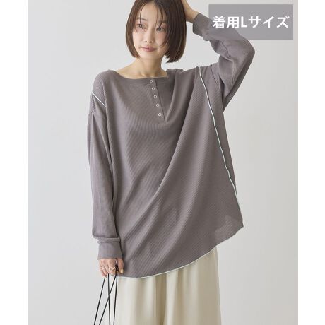 選べる丈で叶うこなれ感ヘンリーネックトップス凹凸のあるワッフル素材が表情豊かで、シンプルながらもこなれた雰囲気を演出してくれる一着です。通気性が良くやわらかな肌触りで、快適な着心地が続きます。ヘンリーネックのボタンデザインが程よいアクセントになり、顔まわりをすっきりと見せてくれるのも魅力です。ドロップショルダーのゆったりとしたシルエットが体のラインを拾いにくく、リラックス感のある着こなしが楽しめます。裾や切り替え部分のメローデザインがさりげない女性らしさをプラスし、デニムやスカートとも相性抜群です。丈が選べることでスタイリングの幅が広がり、日常使いに重宝します。透け感[なし]