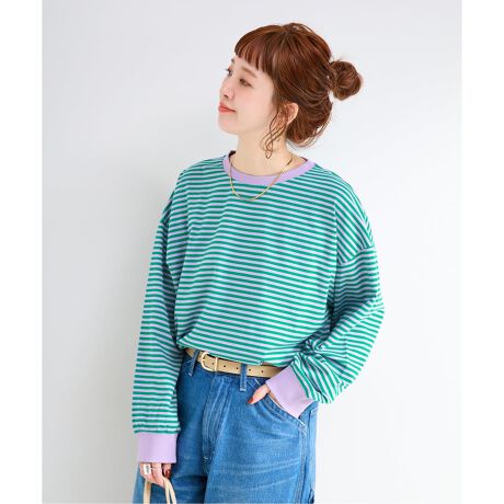 細めピッチのボーダーなのでカジュアル過ぎず、ニットからチラ見せやレイヤードにもぴったりなロングシーズン使い勝手のよいカットソーアイテムになっています。