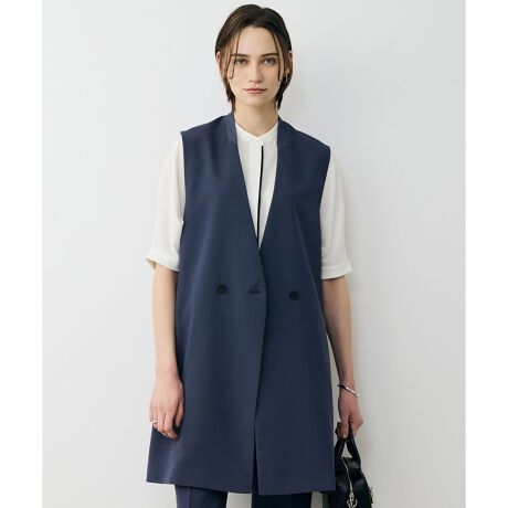 ■デザイン後ろ見頃にシアー素材を使用したミドルレングスのジレです。釦位置や後ろのベルトディテールをやや高めに設定し、スタイルアップ見えするデザインも特徴です。シアー素材が動くたびふわりと揺れ、360度着映えが叶います。同素材のボトムスとセットアップで、お仕事やセレモニーシーンはもちろん、単品での着回し力も高いアイテムです。