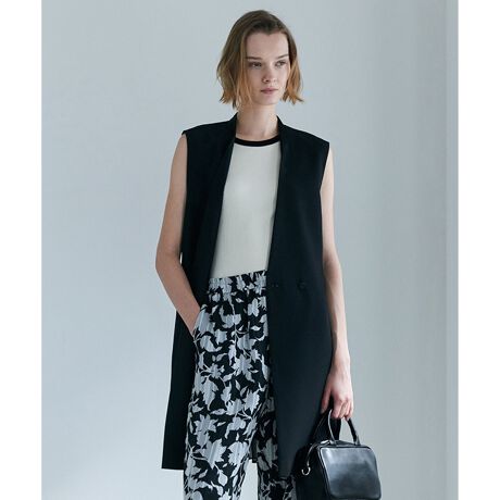 ■デザイン後ろ見頃にシアー素材を使用したミドルレングスのジレです。釦位置や後ろのベルトディテールをやや高めに設定し、スタイルアップ見えするデザインも特徴です。シアー素材が動くたびふわりと揺れ、360度着映えが叶います。同素材のボトムスとセットアップで、お仕事やセレモニーシーンはもちろん、単品での着回し力も高いアイテムです。