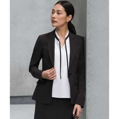 ■デザイン一つボタンですっきりと仕立てた、ノッチドラペルのテーラードジャケットです。ウエストラインを美しく見せるエレガントなシルエットと、シャープな襟のカッティングがポイントです。同シリーズのパンツやスカートと合わせたセットアップスタイルもおすすめで、ビジネスシーンで活躍する一着です。