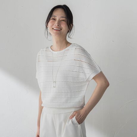 今シーズン注目のレース柄風の編地が、シンプルながら上品な華やかを演出します。