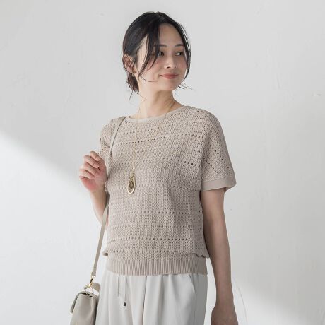 今シーズン注目のレース柄風の編地が、シンプルながら上品な華やかを演出します。