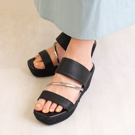 ・幅広ストラップと傾斜を感じにくいウェッジソールで安定感があり履きやすい。