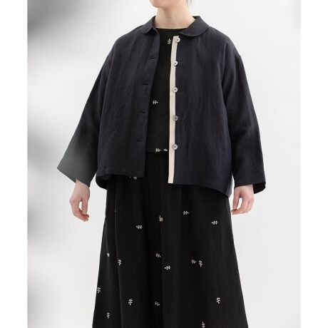 一年中活躍するヘンプ素材の丸襟シャツ。夏は涼しく、冬はあたたかい天然素材ならではの快適な着心地。吸水速乾性、高強度、抗菌性にも優れています。後ろはヒップが隠れる丈で夏のジャケット、羽織りとしても使いやすい一枚です。後ろ中心の配色や、開けた時の下前の配色がアクセント。両サイドポケットつき。