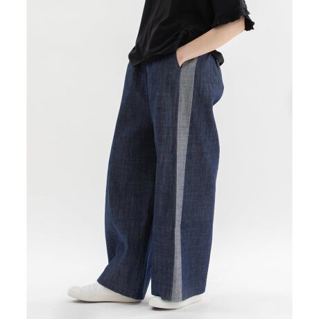 トラックパンツ風のサイドラインデザインを取り入れたイージーパンツ。リラックスしたシルエットでラフに履けるフルレングスのワイドシルエット。右後ろにスワンネームのワンポイント入り。ウエストはゴム仕様で内紐つき。両サイドポケットつき。