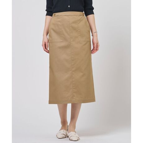 ■デザイン程よくボディラインから離れる、Iラインシルエットのナロースカート。ストレートラインをベースに、裾に向かってわずかにゆとりを持たせることで、女性らしいニュアンスをプラスしました。後ろ中心にはスリットが入っており、足さばきがスムーズで抜け感のある仕上がりに。ウエストの前部分には、タブと釦のディテールを施し、トップスをインした際のアクセントにしています。前ポケットはステッチのみのデザインですっきりとさせ、後ろウエストはゴム仕様にすることで、長時間の着用でもストレスフリーな穿き心地を叶えました。オンオフ問わず活躍し、コーディネート全体を品よくまとめてくれる頼れるアイテムです。