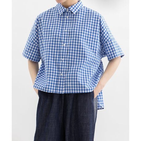 メンズライクなディテールのワイドな半袖シャツ。太い前立てと小さな袖のバランス感が絶妙で、襟の後ろはボタンダウンデザインになっています。前は真っ直ぐ、後ろはカーブした裾も特徴的。裾のロゴプリントや開けた時にちらりと見える配色ステッチもポイントです。