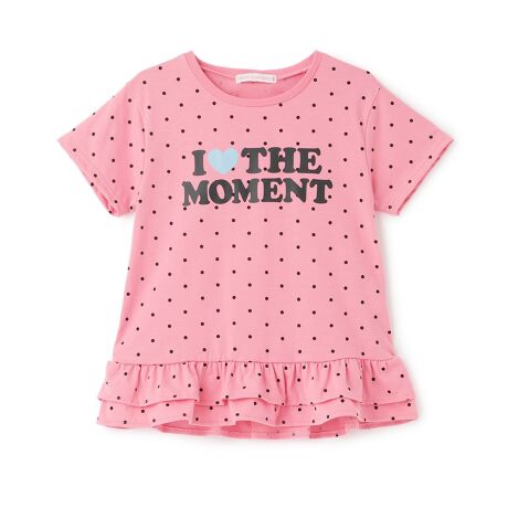 小さなドットとトレンドの裾フリルが目を引くガーリーなTシャツです。