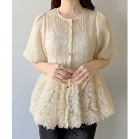 mipiarl フラワーモチーフチュールペプラムブラウス