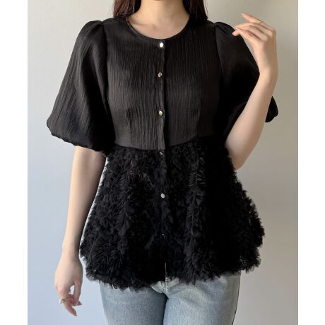 mipiarl フラワーモチーフチュールペプラムブラウス