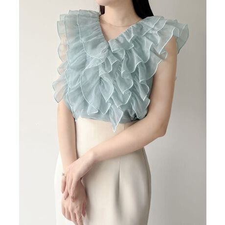 mipiarl メニーフリルノースリブラウス