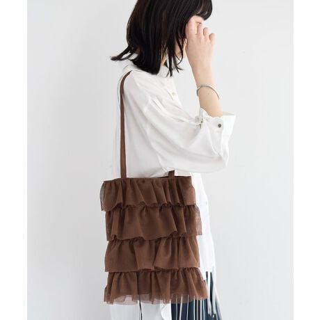 軽やかなメッシュ素材とフリルデザインが印象的なトートバッグ。