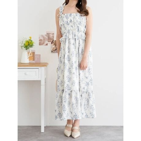 [型番:26550735318]肩のリボンとシャーリングデザインがポイントのキャミワンピース。程よくフィットする上身頃と、裾にかけて広がるシルエットでメリハリのある印象に仕上げています。軽やかな素材感で、1枚でもレイヤードでも着回しやすい一枚です。肌寒い時期はコンパクトなカーディガンやデニムジャケットを羽織るとバランスよくまとまります。モデル(A柄/C柄/黒着用)身長:165cmMサイズ着用