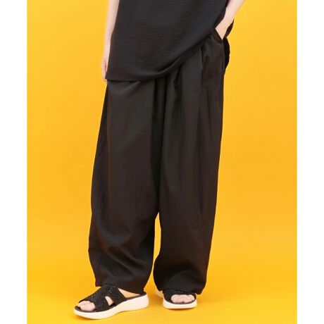 シャカシャカっとしたナイロン素材が特徴のコクーンパンツ。