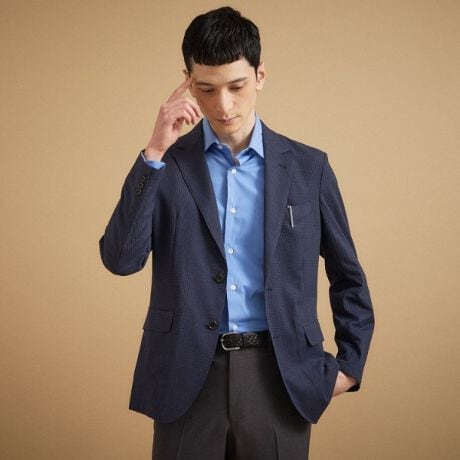 ストレッチあり、肌離れよく、快適に着用できる、この夏おすすめしたい「トリコットサッカージャケット」のご紹介です。