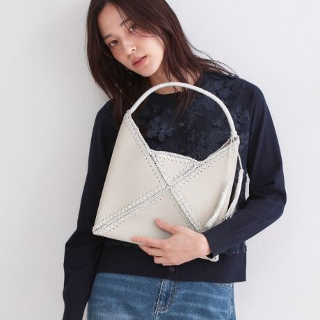 夏らしい雰囲気を高めてくれるラメ糸と合皮素材を使用したデザインハンドバッグ。