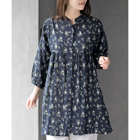 刺繍×花柄プリント7分袖シャツワンピース