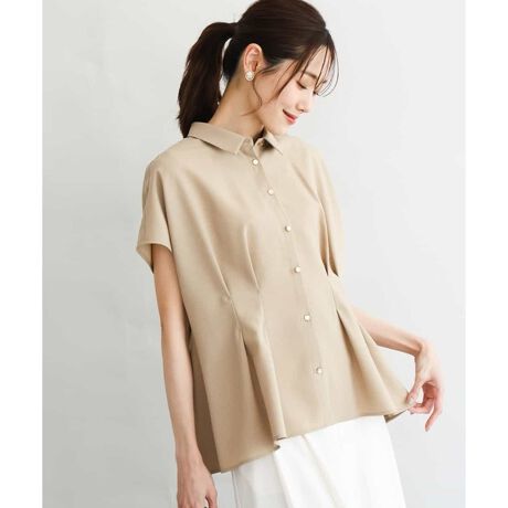 [洗える]リネンライクストレッチ ウエストタックデザイン衿付きブラウス