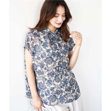 涼しげな印象の更紗模様のプリントシフォンブラウス。どちらを前にしても着こなせる前後2way仕様で、引っかけて垂らすだけのタイデザインがポイントに。